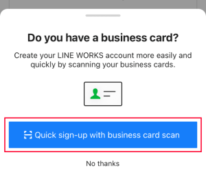 1. Tap 'Get started' after opening an app 2. Tap 'Start as Administrator' 3. Select the industry and number of employees and then tap 'Next' 4. Tap 'Quick sign-up with business card scan' 5. Place your business card into the frame, take a picture, and then tap 'Use' 6. Enter your company/organization name and tap 'Next' it is necessary to set up a company/organization with a name that represents your team or company. 7. Enter your full name and tap 'Next' 8. Enter your phone number and click 'Request verification number' 9. Enter 4-digits of verification you received 10. Enter your email address and tap 'Complete' 11. Your account is all set to go! 1. Visit NAVER WORKS Brandsite 2. Click 'Get started' 3. Click 'Start as Administrator' 4. Select the industry and number of employees and then click 'Next' 5. Enter company/organization name and click 'Next' it is necessary to set up a company / organization with a name that represents your team or company. 6. Enter your full name and click 'Next' 7. Enter your phone number and click 'Request verification number' 8. Enter 4-digits of verification number you received 9. Enter your email and click 'Complete' 10. Your account is all set to go!Mobile App