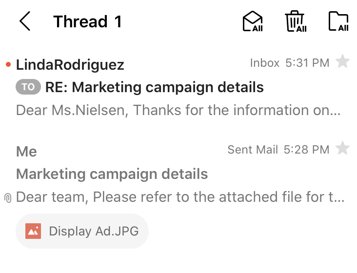 In a mailbox with thread view enabled, you can group and view emails exchanged with the same contact.