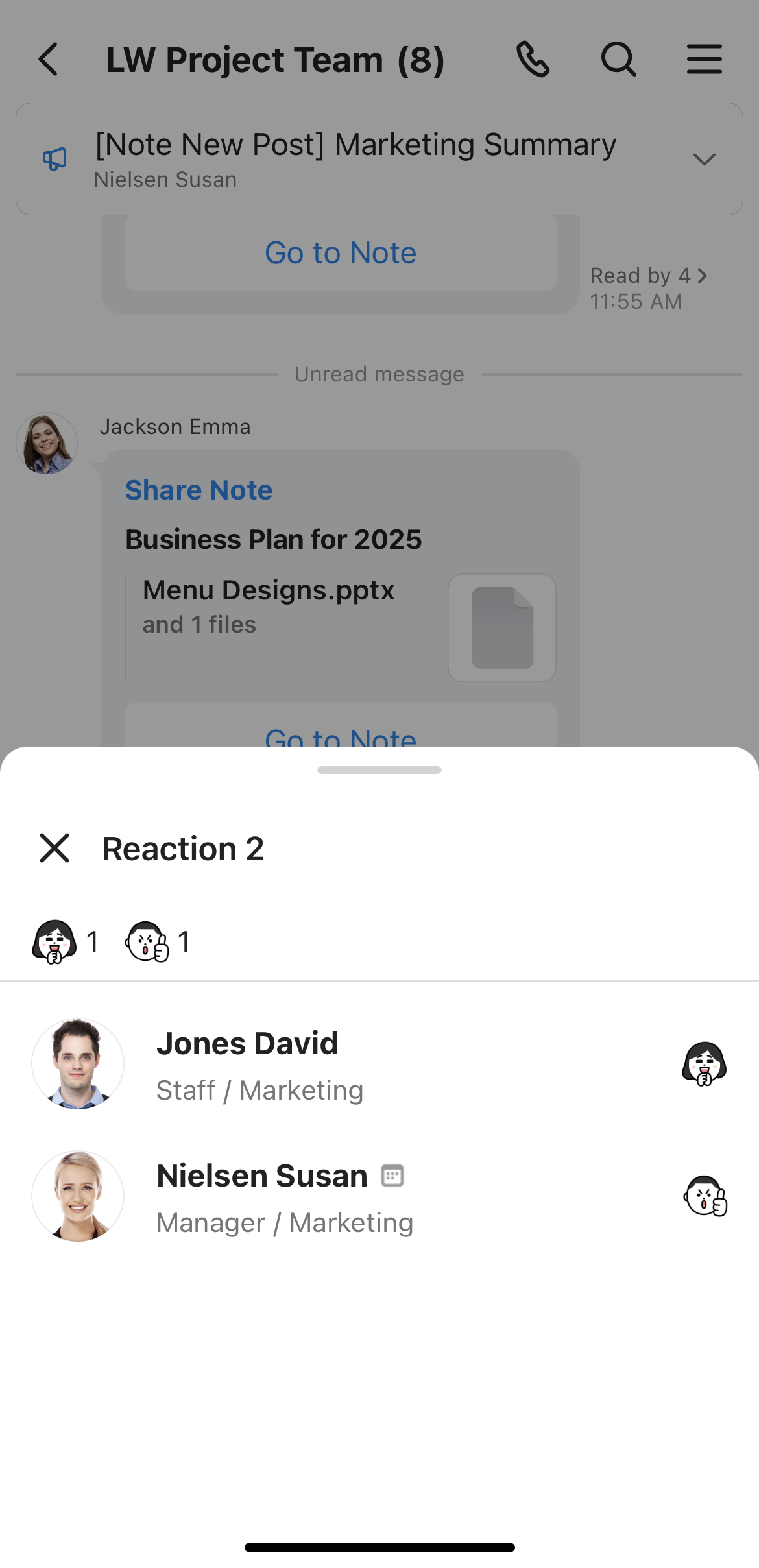 - Check the list of members who have reacted by clicking on the reaction below the message, image, or video.