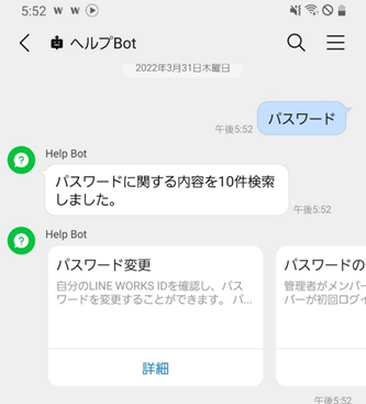 また、 LINE WORKSの「ヘルプbot」とのトークルームにキーワードを送信すると、ヘルプセンター内の関連するコンテンツが表示されるため、ヘルプbotを使用した検索もご活用ください!
