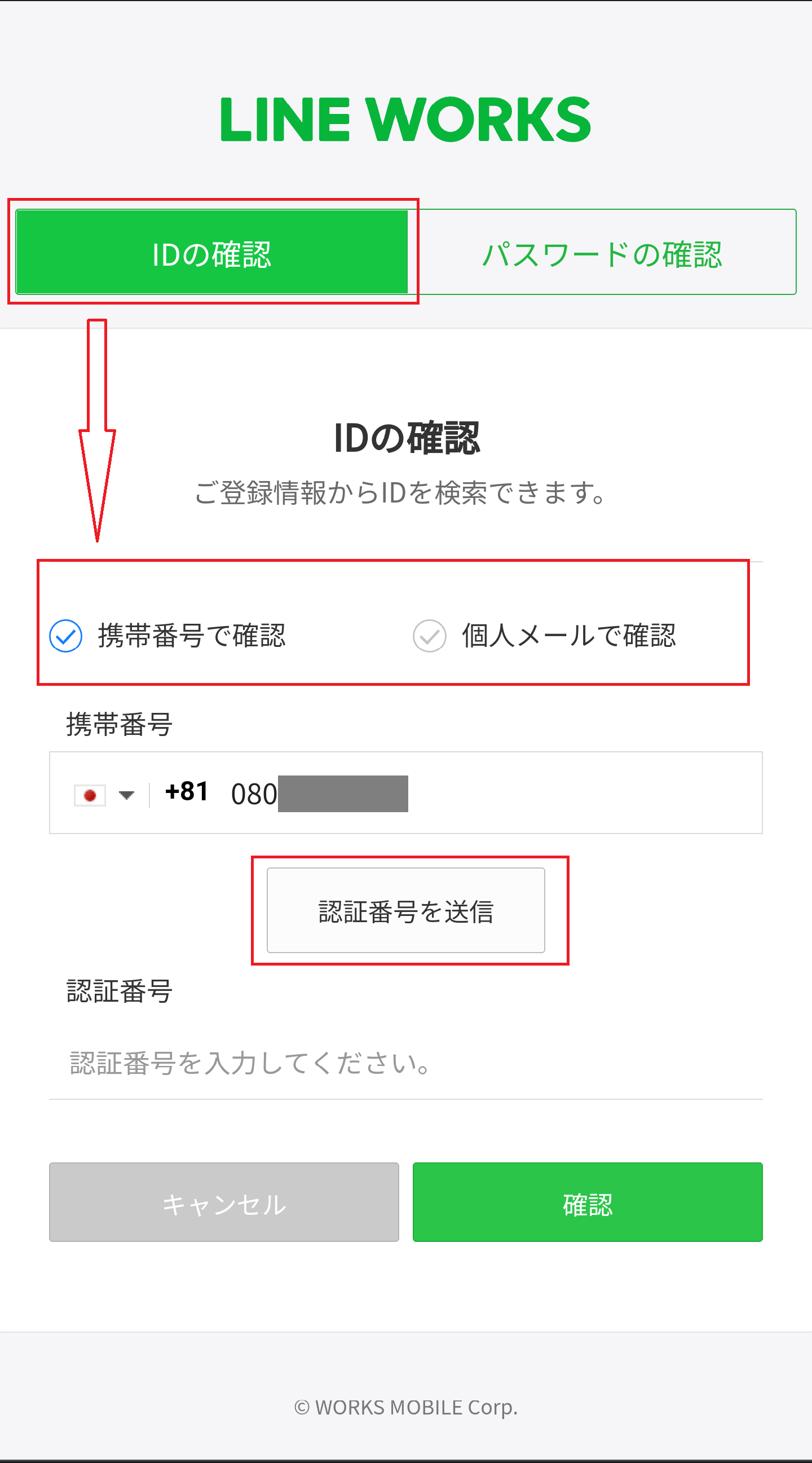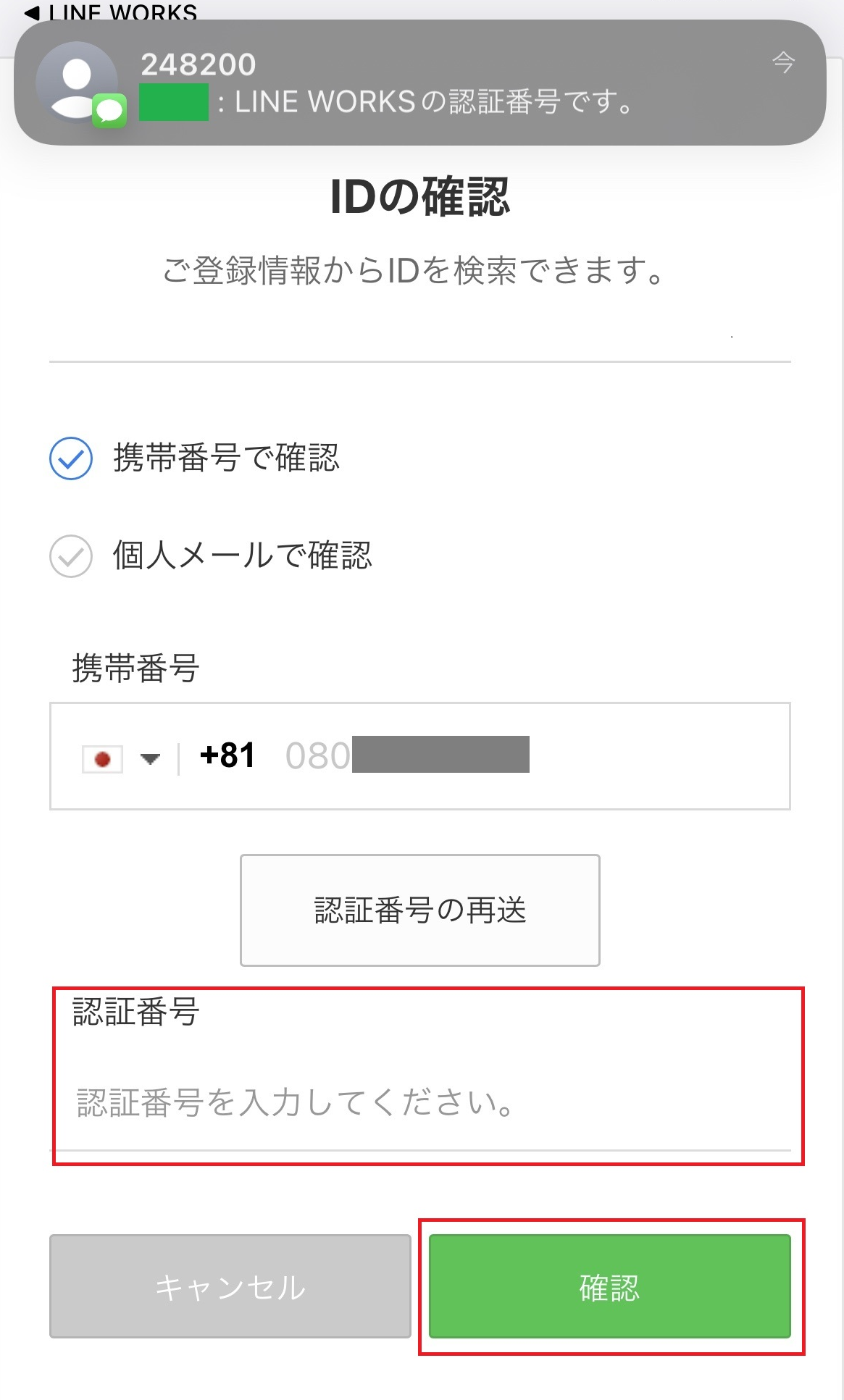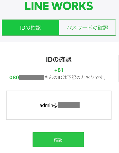 このように確認画面が表示され、電話番号が登録されているIDが表示されます。