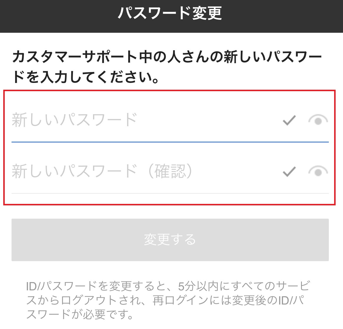 正しい認証番号を入力すると、以下のパスワード変更が表示されますので、新しいパスワードを設定してください。