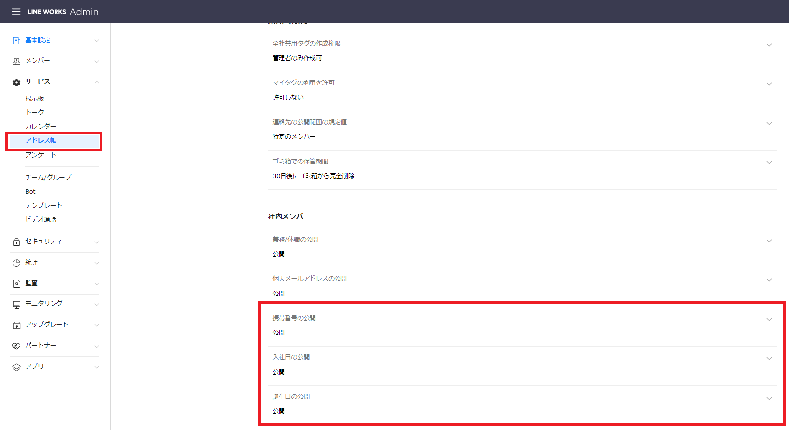 今回は「携帯電話」「入社日」「誕生日」を「公開しない」に変更します。