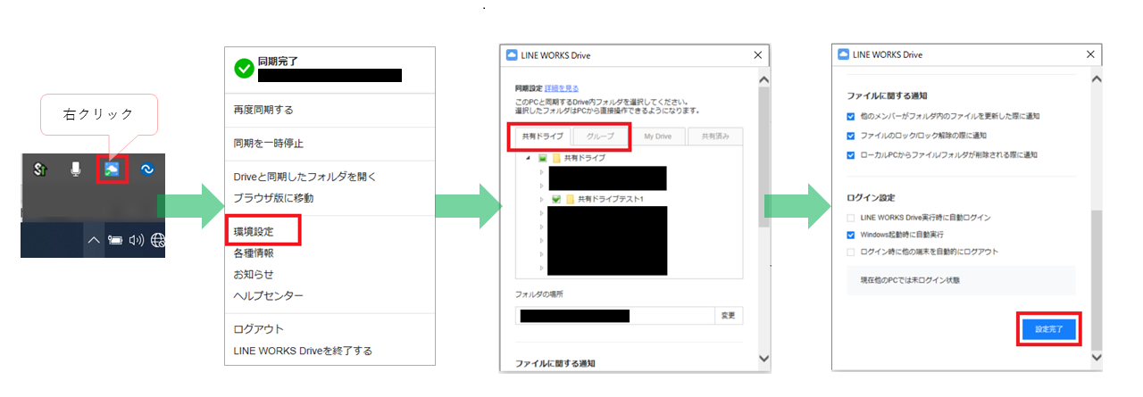 お手数をお掛けしますが、デスクトップ下部のタスクトレイから「LINE WORKS Drive」アイコンを右クリックし、「環境設定」から同期する「共有ドライブ」や「チームグループフォルダ」を選択して、「設定完了」ボタンをクリックして下さい。