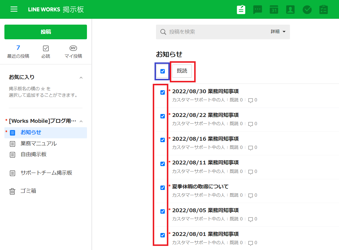 既読にしたい投稿にチェックを入れ、「既読」をクリックするとチェックした投稿が既読になります!