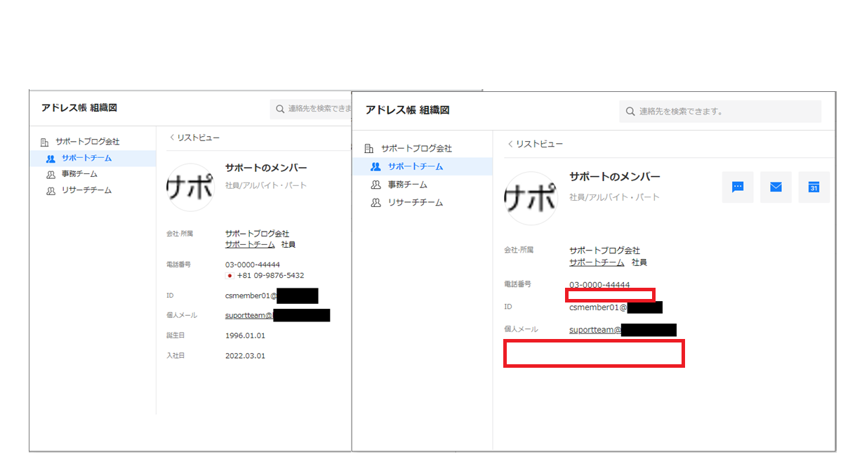 アドレス帳でメンバーの情報を表示すると、「公開しない」に設定した情報が非表示になりました。