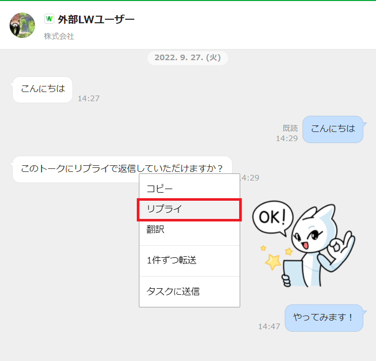 ✓ 外部LINE WORKSユーザーとのトークでリプライが使用可能