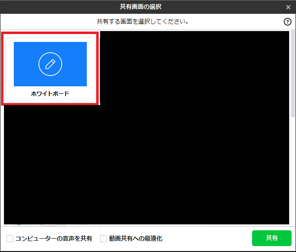 「画面共有」アイコンをクリックし、「共有画面の選択」で「ホワイトボード」を選択してください。