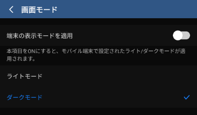 なお、OS側で設定頂くダークモード仕様に従う以外に、アプリ単体でも設定することが可能です。