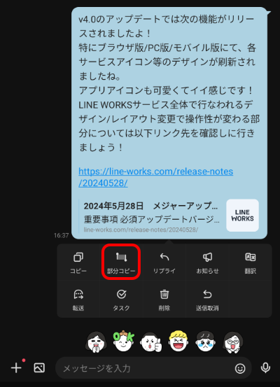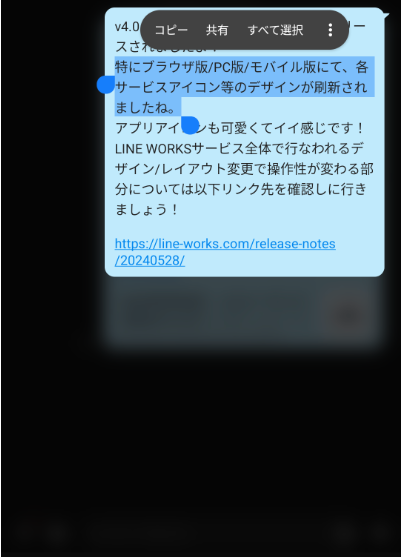 今まではメッセージ単位でコピーする必要がありましたが、この機能によりメッセージ内の一部分をコピーできるようになりました。