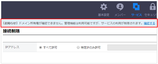 管理者画面の上部に下図のような[お知らせ]が表示されている間は、LINE WORKSのサービスの利用が制限されます。