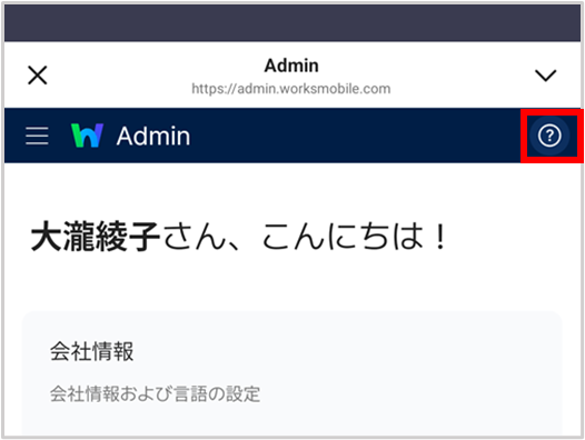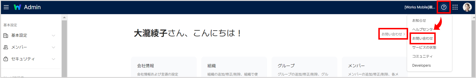 管理者画面のトップページにある「お問い合わせ」をクリックするか、「?」アイコンをクリックして表示されるメニューから「お問い合わせ」をクリックします。