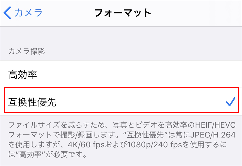 [設定]>[カメラ]>[フォーマット]>[互換性優先]