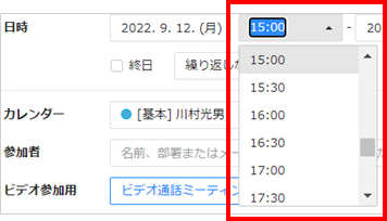 ブラウザ版の予定作成では、「日時」の時間を指定するドロップダウンメニューから30分単位で時間を選択できます。
