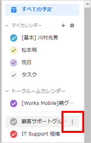 図5. 「予定表(週)」画面(ブラウザ版) 予定の色変更前 - カレンダー画面左側のマイカレンダー、トークルームカレンダー一覧から、色を変更したいカレンダーを探して[…]アイコンをクリックします。