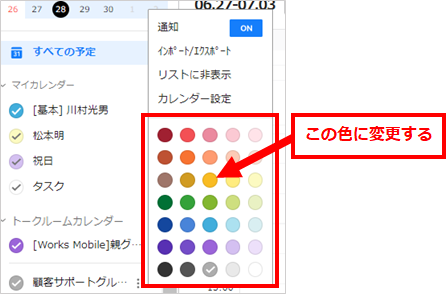 図6. 「予定表(週)」画面 マイカレンダー、トークルームカレンダー一覧(ブラウザ版) - 下図のメニューが表示されるので、変更したい色を一覧から選択します。