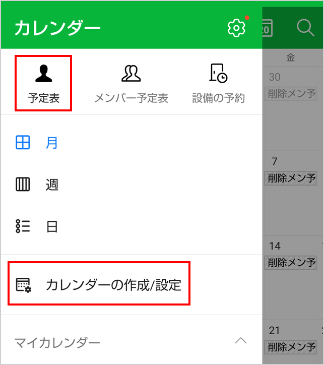をタップして予定表を開きます。[カレンダーの作成/設定]をタップします。