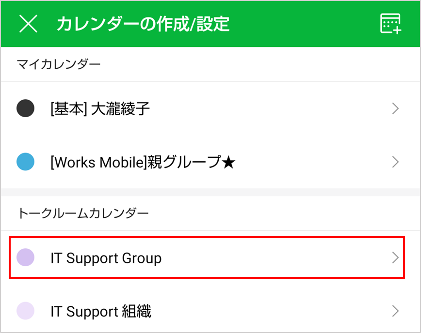 - 「カレンダーの作成/設定」画面で色を変更したいカレンダーをタップします。
