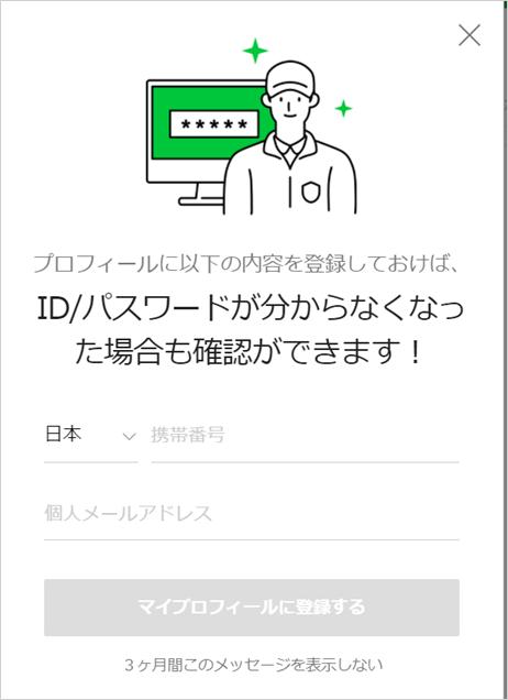 ポップアップ画面で携帯番号か個人メールアドレス、またはその両方を入力し[マイプロフィールに登録する]をクリックすると表示されなくなります。