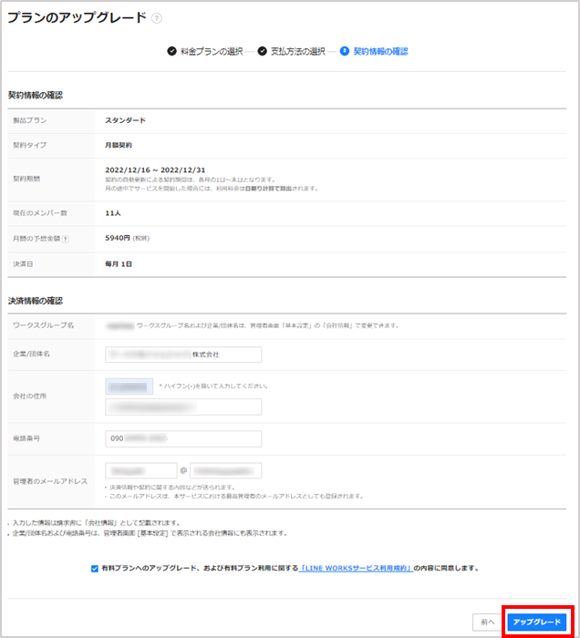 図1. フリープランからスタンダードプランへの「プランのアップグレード」画面