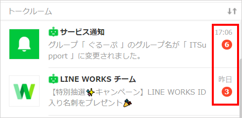 「トークルーム一覧」では閲覧していない未読のトークがある場合、トークルームの右側に赤い丸に未読のトーク件数を示すバッジが表示されます。
