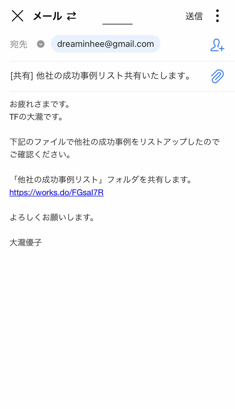 トーク、メール、タスクなど他の機能にもフォルダからすぐに送信/添付が行なえるので便利です。