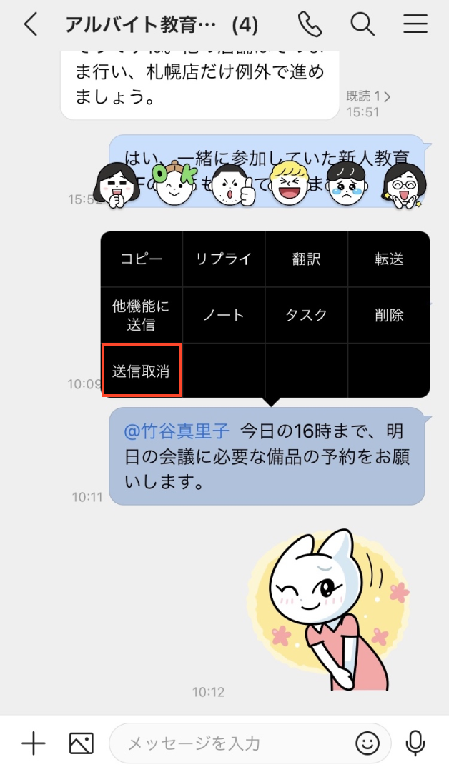 送信したトークの打ち間違いや、誤送信も「送信取消」によってトークルームから削除できます。