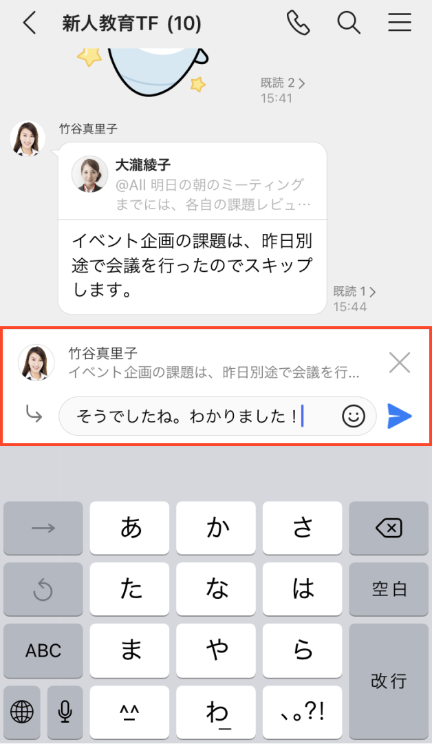 どのトークに対しての返信なのか分かりやすく、選択すると該当のトークに移動できるため、