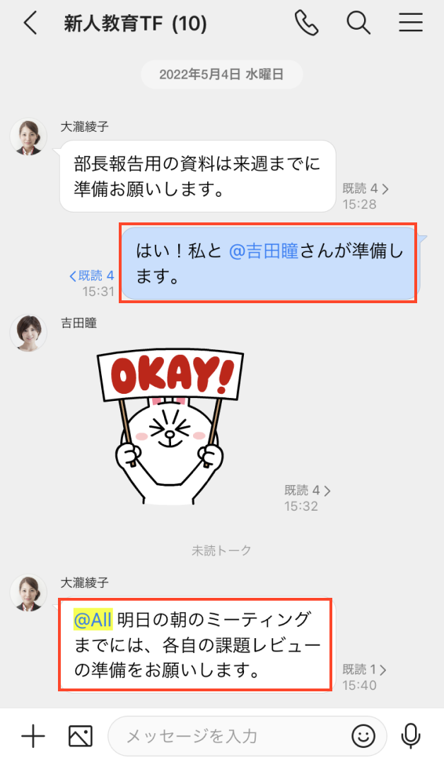 「@」を入力し対象メンバーを選択すると、メンバーの名前を強調したトーク送信が可能です。