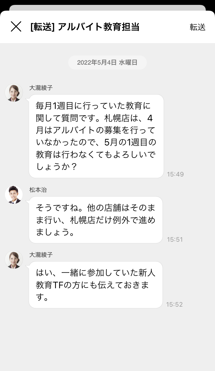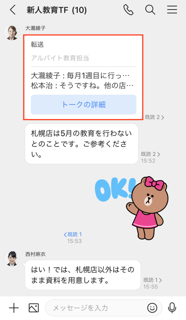他のトークルームのメンバーにトークを共有したい場合には、転送機能を使用しましょう。