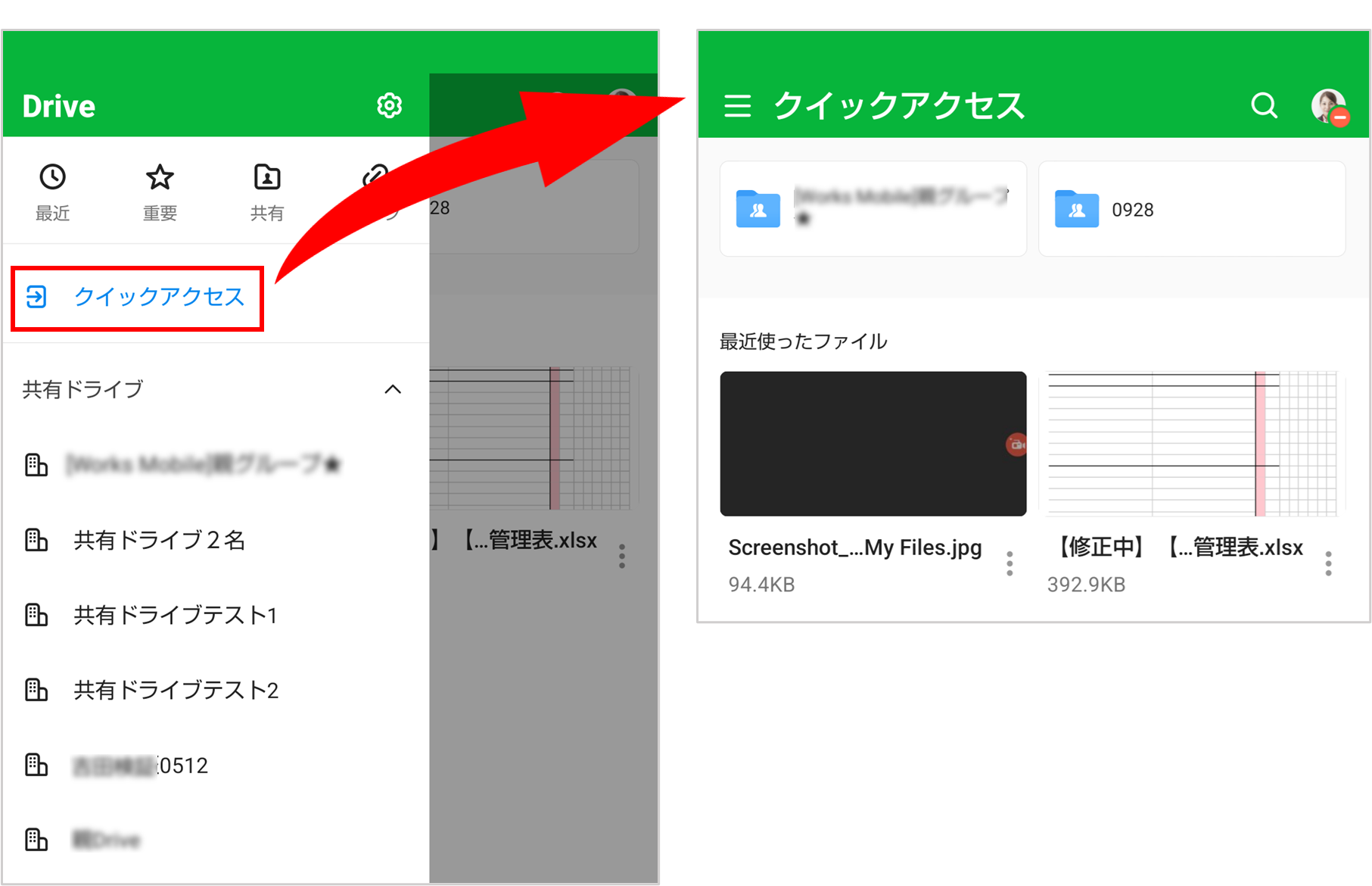 Driveの「クイックアクセス(モバイル版アプリのみ)」では、利用頻度の高いフォルダや直近で操作したファイルを表示することができます。クイックアクセスでは、画面上部にフォルダ、その下にファイルが表示されます。