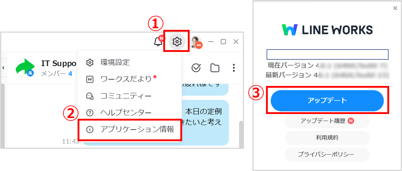 LINE WORKSアプリ >[歯車]アイコン >[アプリケーション情報]からアップデートします。