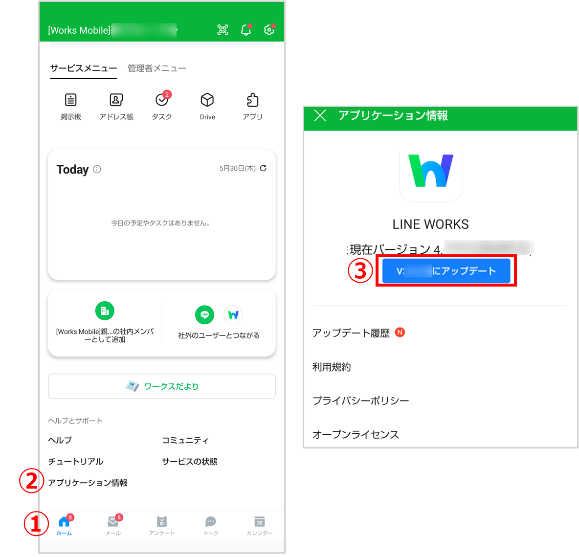LINE WORKSアプリ >[ホーム]アイコンをタップ >[アプリケーション情報]からアップデートします。