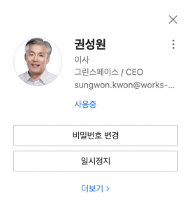 Admin 서비스 이용 중 표시되는 구성원이 누구인지 쉽게 파악하고, 구성원 관련 업무를 신속히 처리할 수 있도록 구성원 정보와 비밀번호 변경, 휴직 설정 등의 기능을 담아 미니 프로필로 제공합니다.