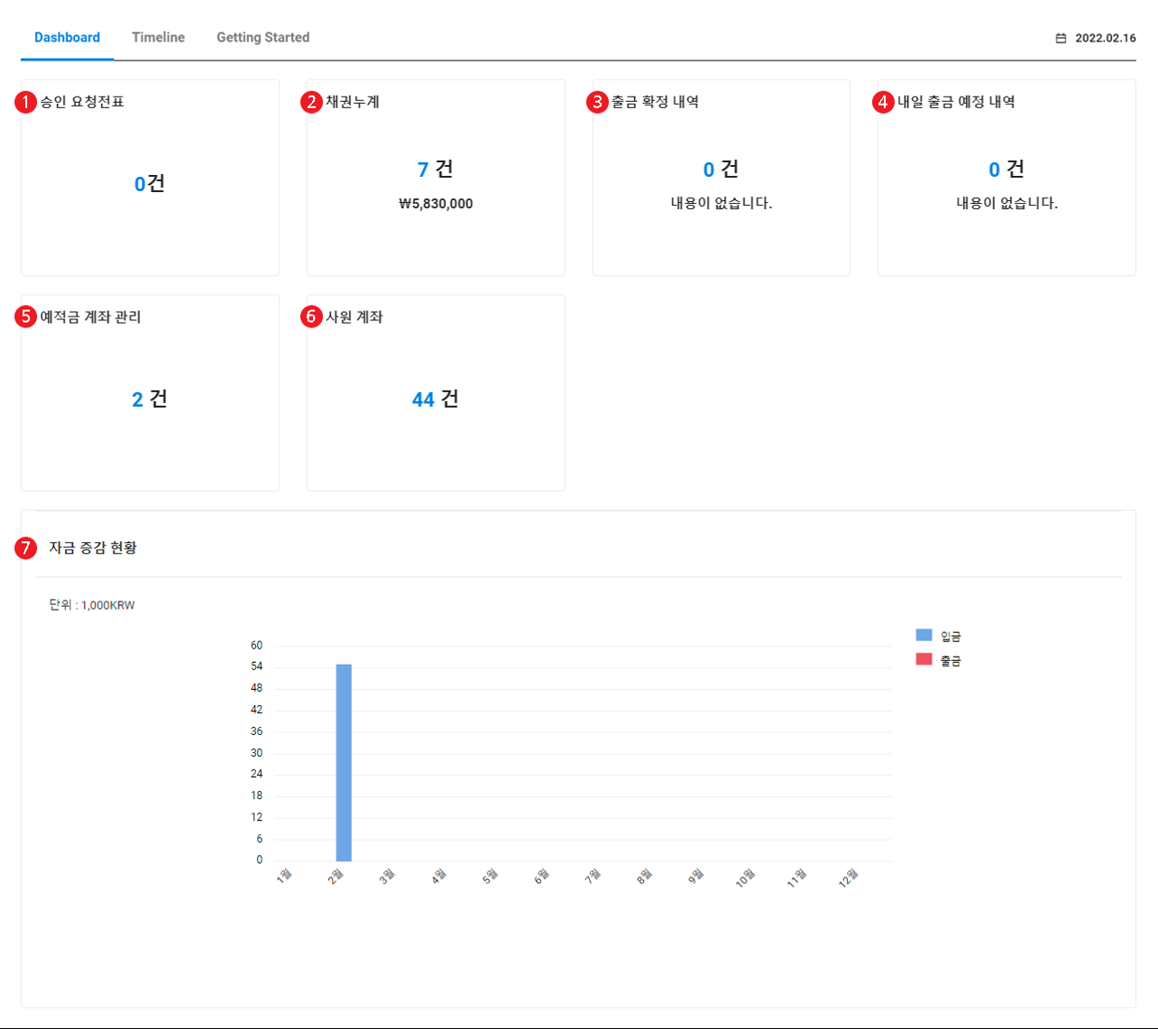 회계 메인 화면은 다음과 같이 구성되어 있습니다.