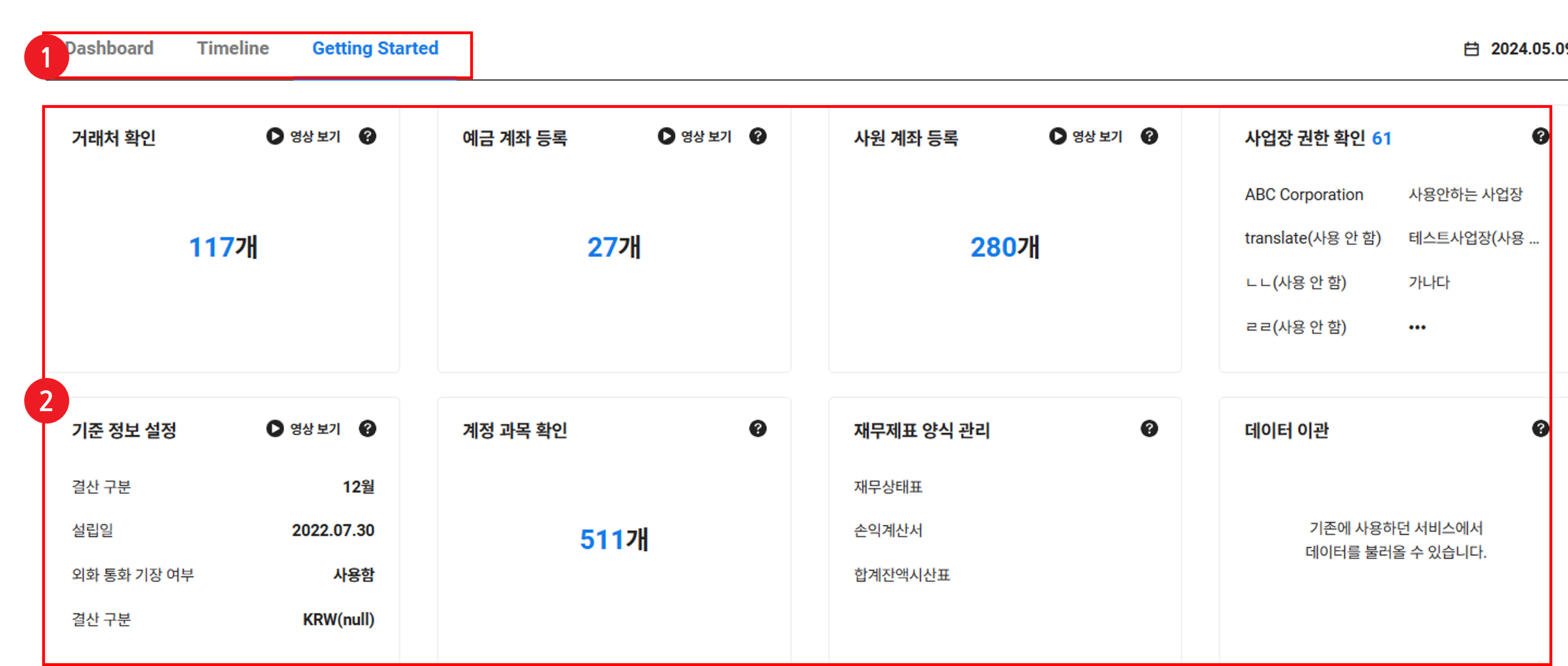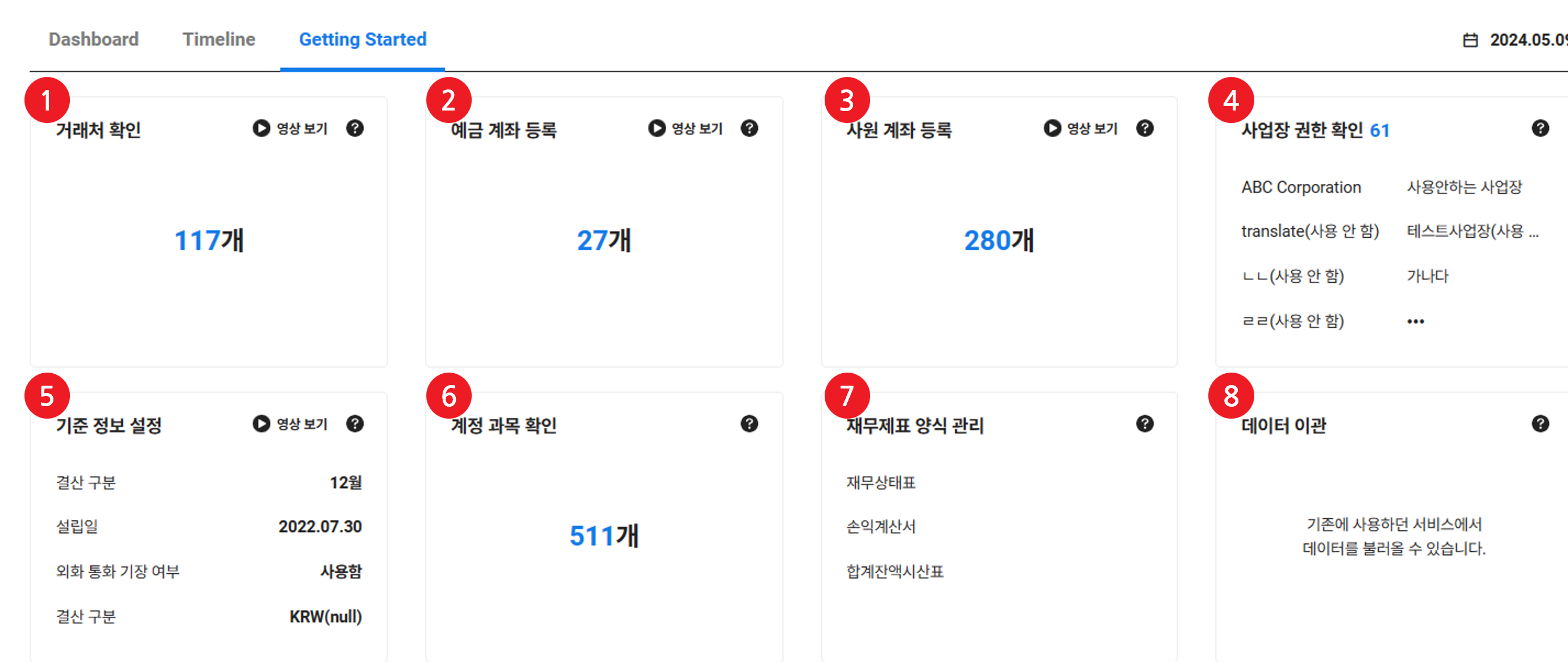 회계 서비스를 원활히 사용하기 위해서는 Getting Started 화면의 카드 순서에 따라 모든 항목의 설정을 완료해 주십시오.