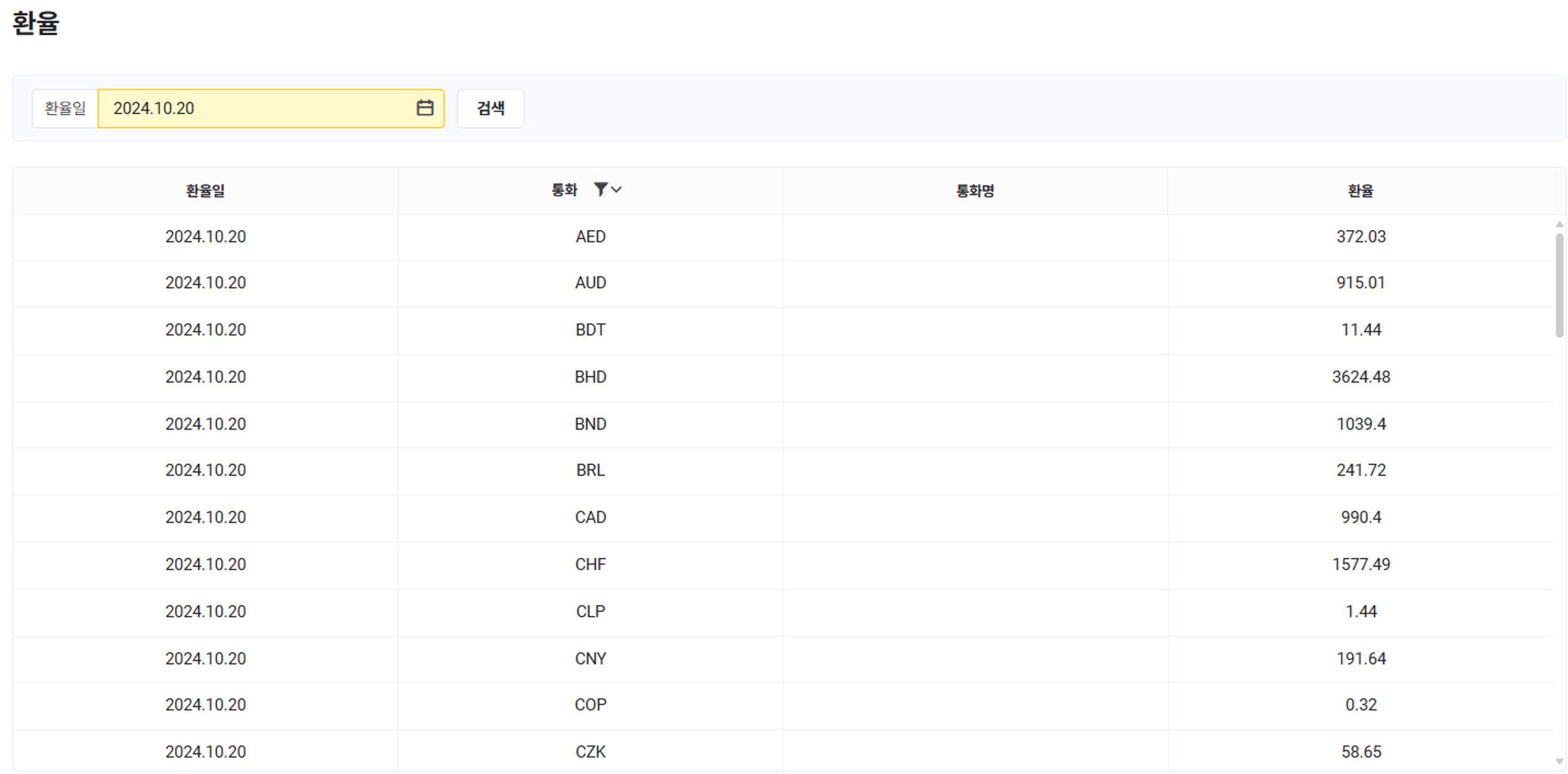 외환은행에서 고시한 날짜별 환율 정보를 확인할 수 있습니다. '회계 > 설정 > 회계 설정' 메뉴에서 설정한 기준 통화에 대한 환율이 표시됩니다.