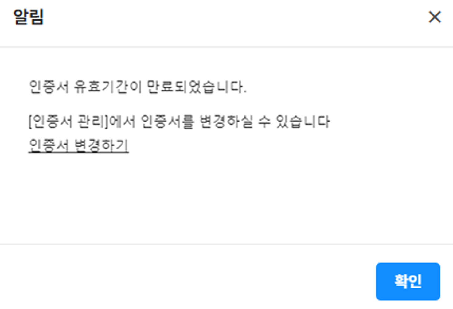 - '인증서 변경하기'를 클릭하여 유효 기간이 만료된 인증서를 확인한 후 인증서를 재등록합니다.