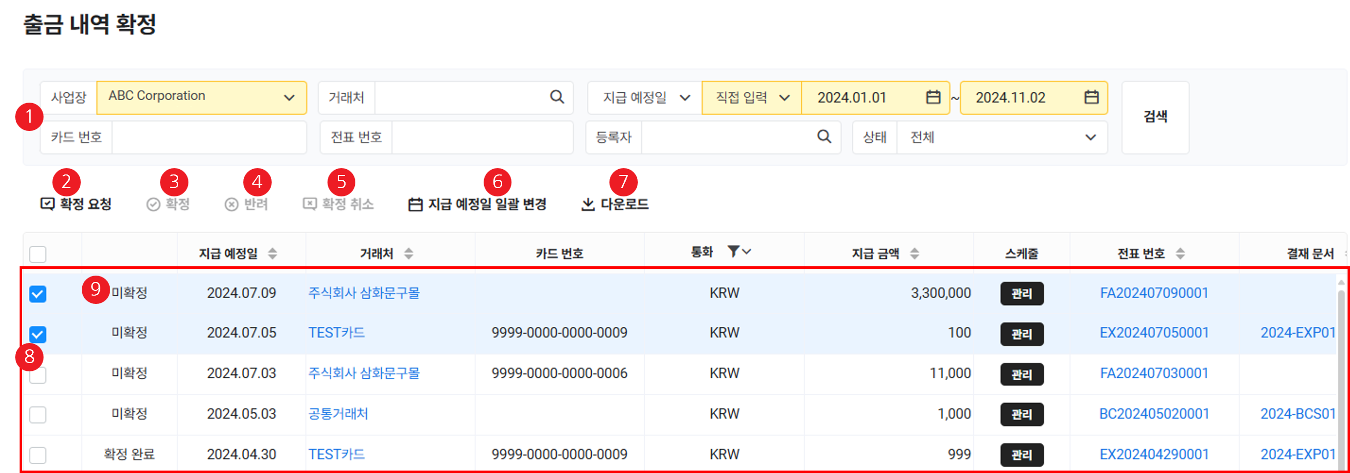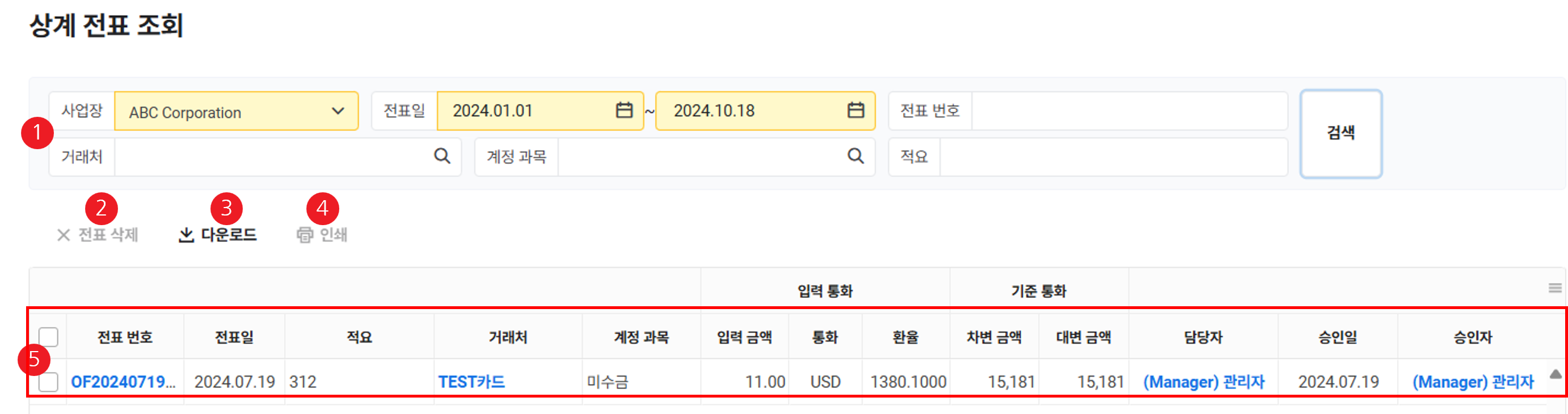 - 입력한 조건에 해당하는 출금 전표 목록이 조회됩니다.