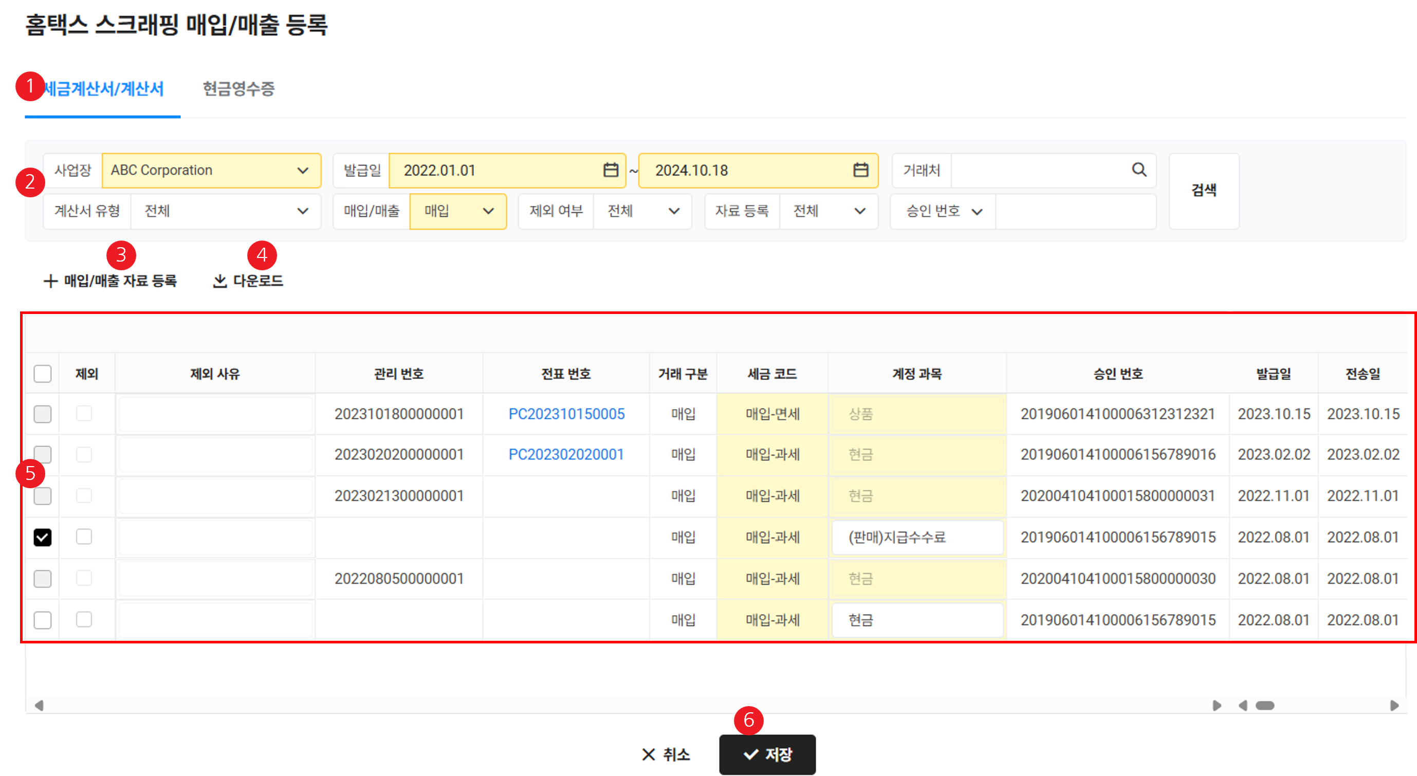홈택스 스크래핑 매입/매출 등록 화면은 다음과 같이 구성되어 있습니다.