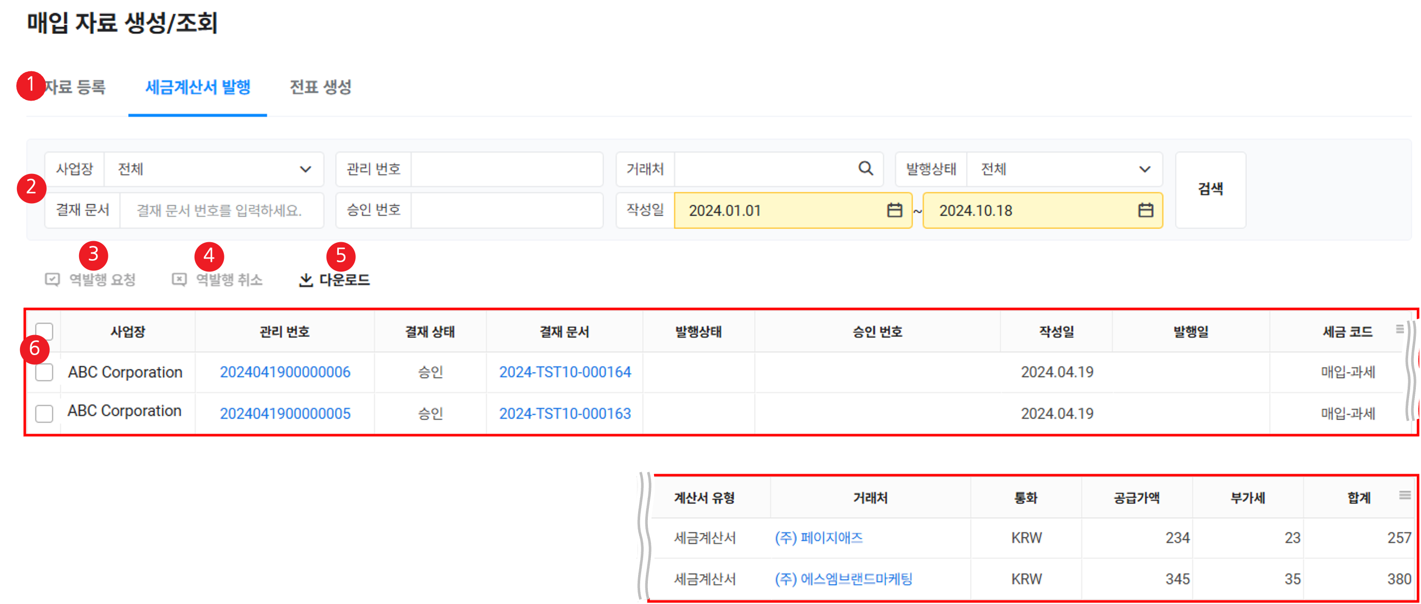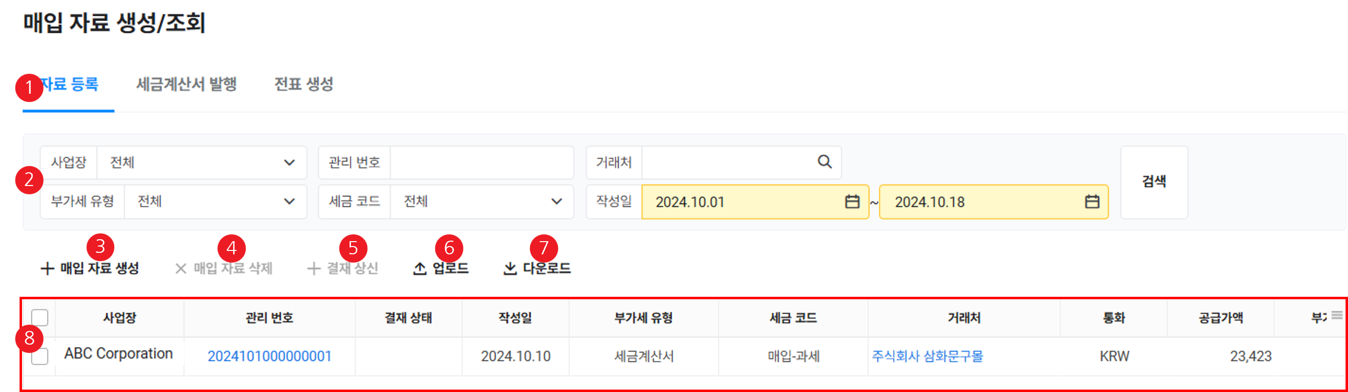 | ② 검색창 | 매입 자료를 작성일, 사업장, 거래처, 부가세 유형, 세금 코드, 결재 상태, 전표 번호, 결재 문서 조건에 따라 검색 |