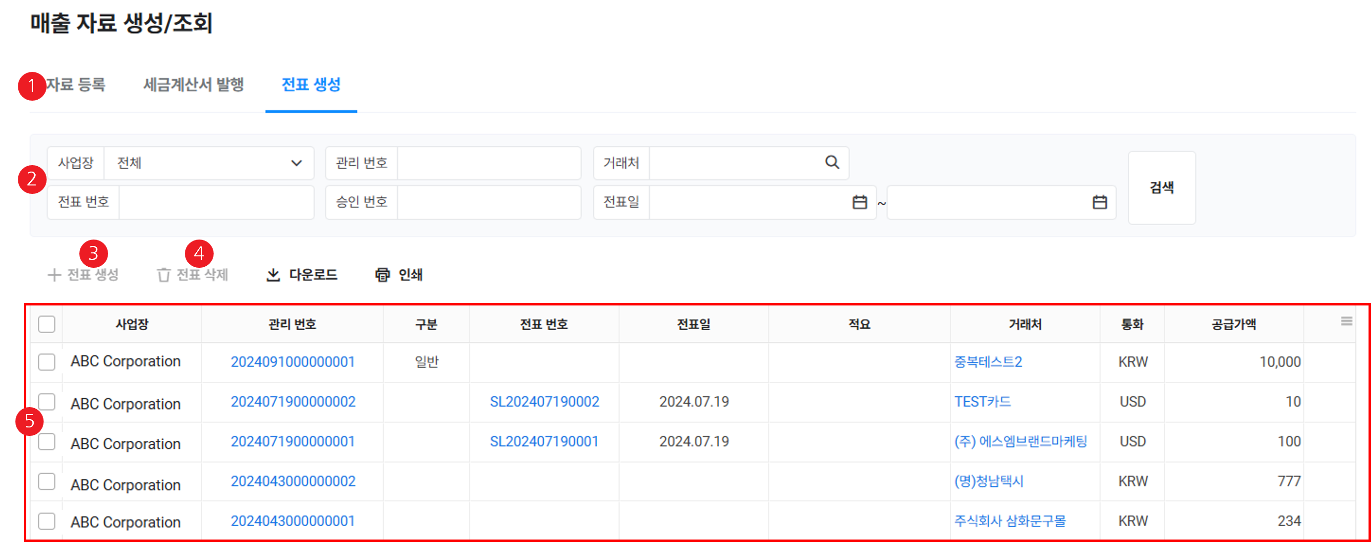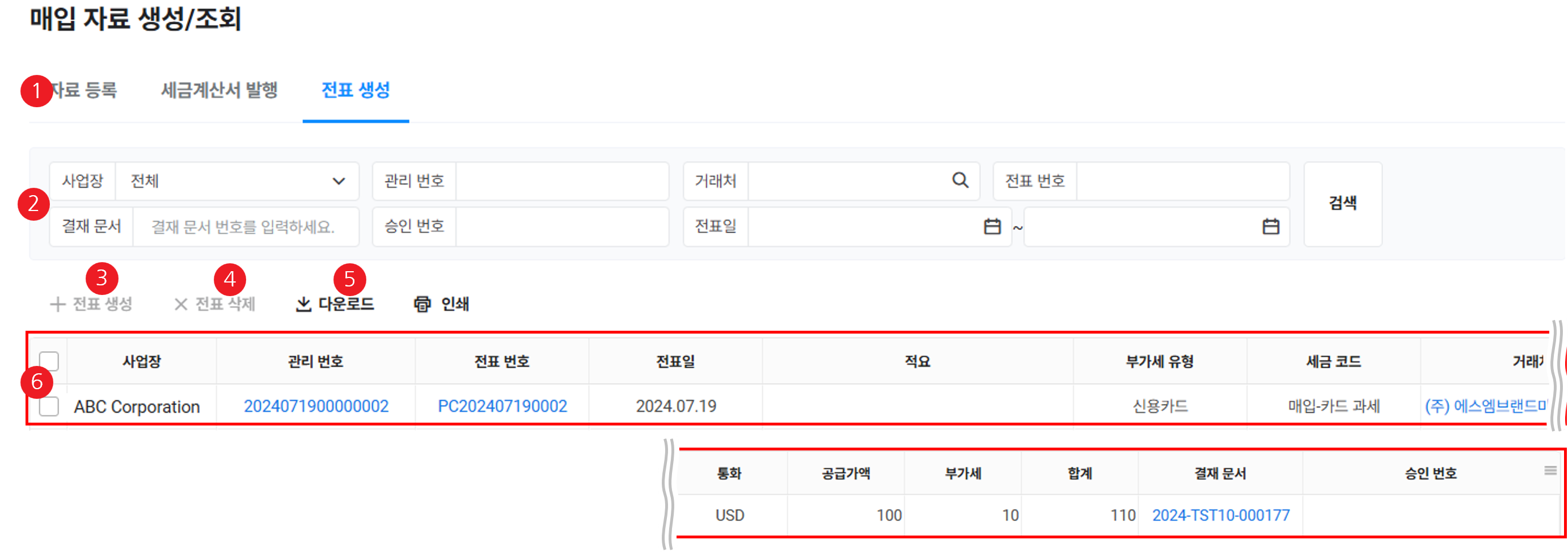 - 매입/매출 자료가 생성되면 각 자료에 관리 번호가 조회됩니다.