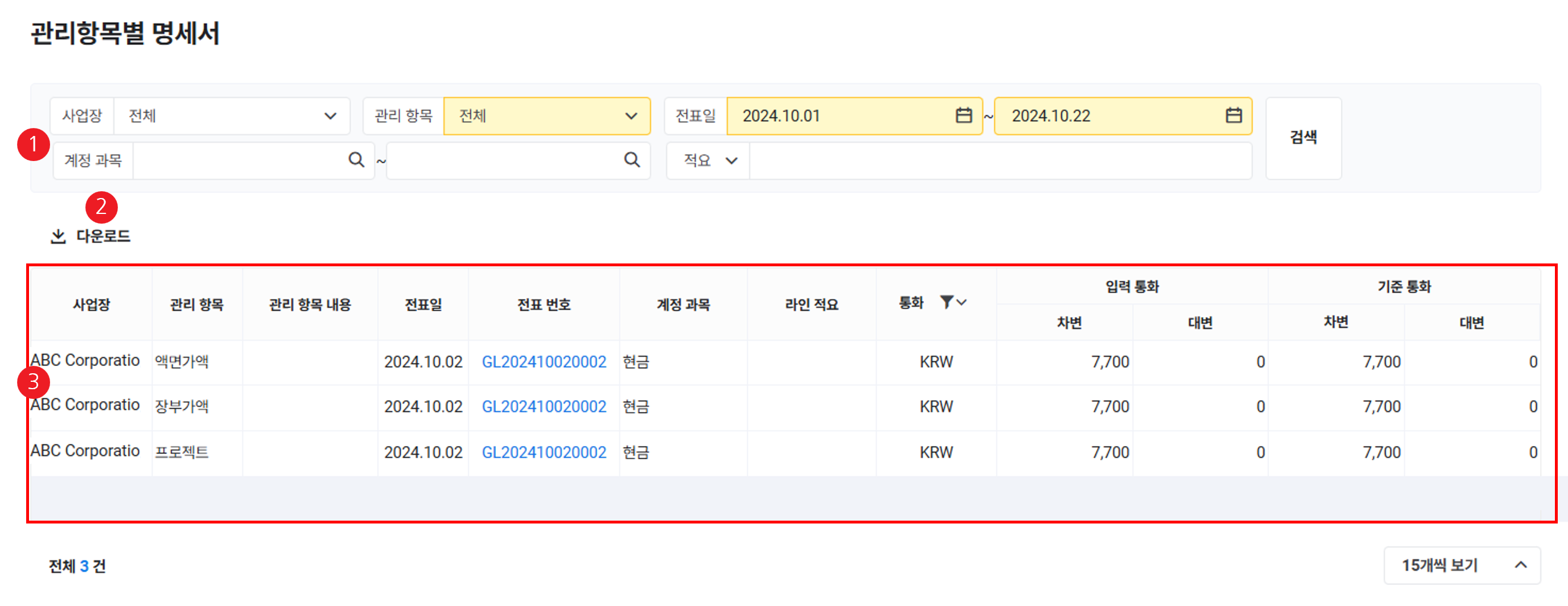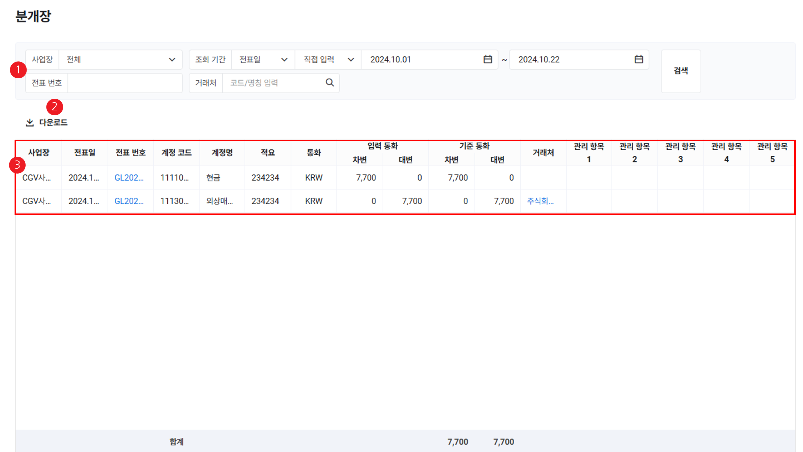 | ② 다운로드 | 관리 항목별 분개 내역 목록을 엑셀 파일로 다운로드 |