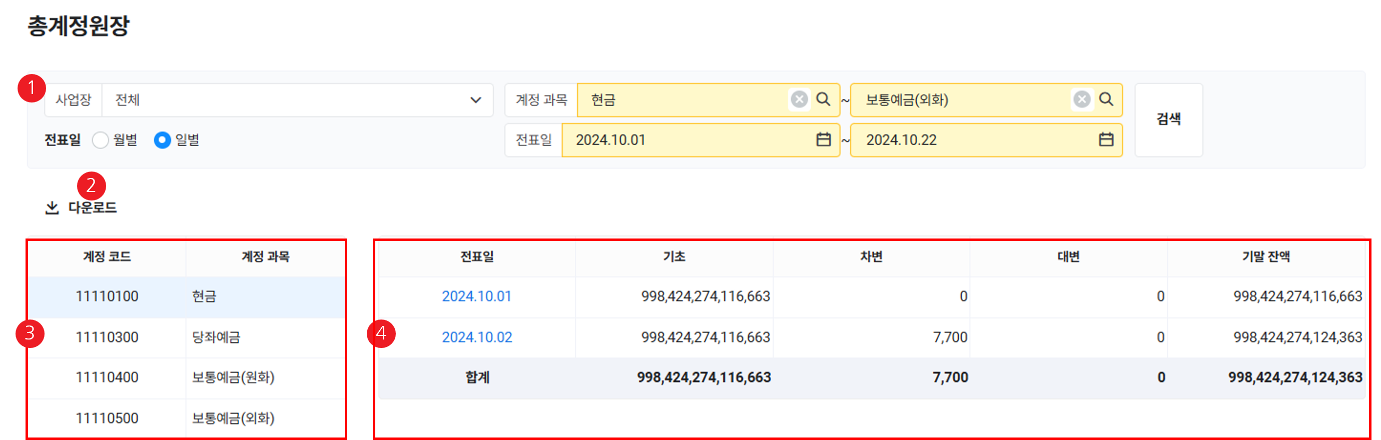 | ② 다운로드 | 계정 과목별 금액 목록을 엑셀 파일로 다운로드 |