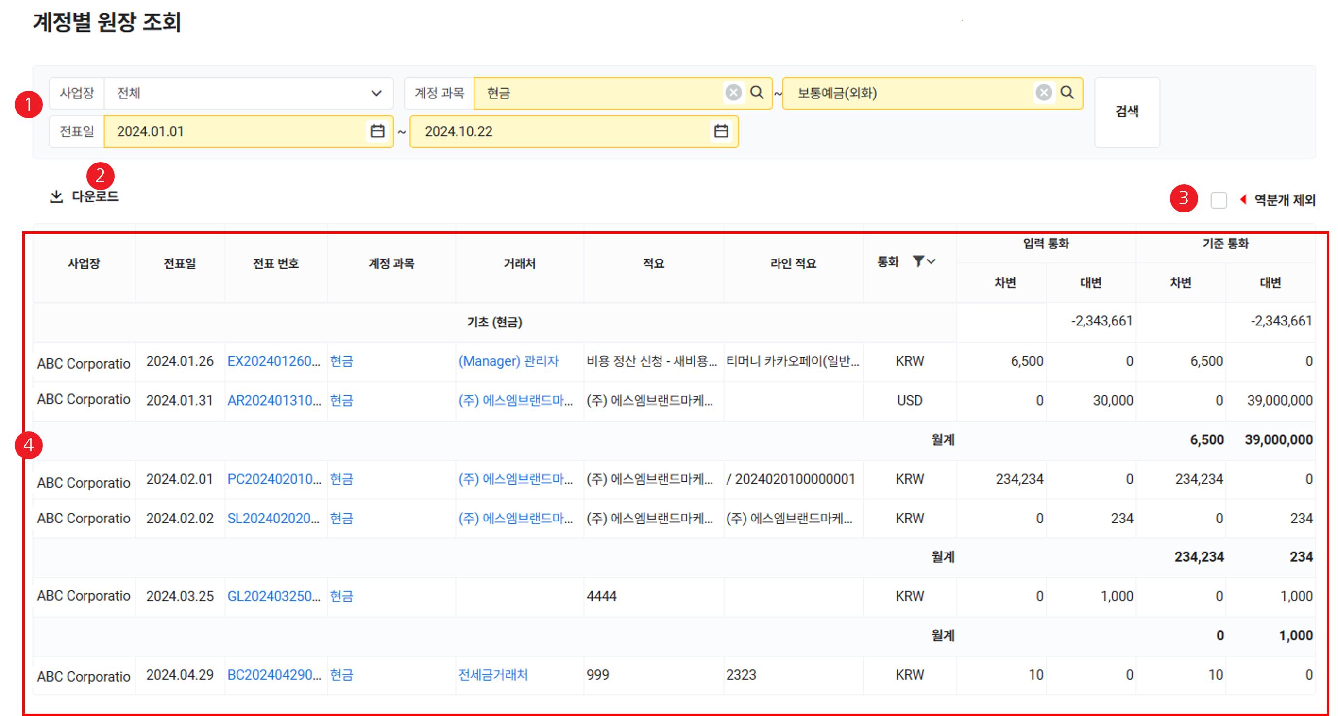 | ④ 계정 과목별 거래 내역 목록 | 계정 과목별 거래 내역을 목록으로 확인 각 상세 정보를 클릭하여 정보 조회 가능