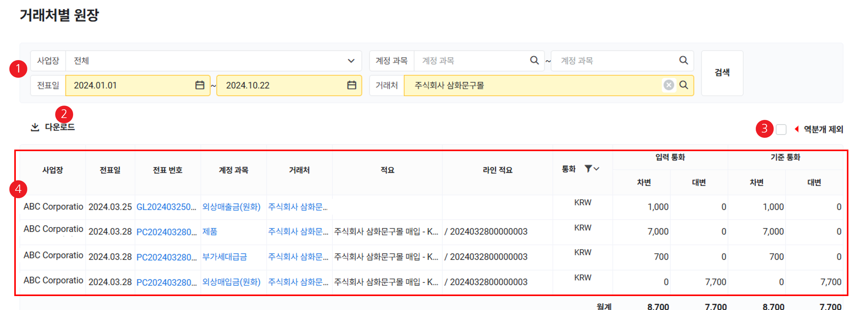 - 검색 창에서 조회할 거래처별 거래 내역 조건을 입력한 후 '검색'을 클릭합니다.