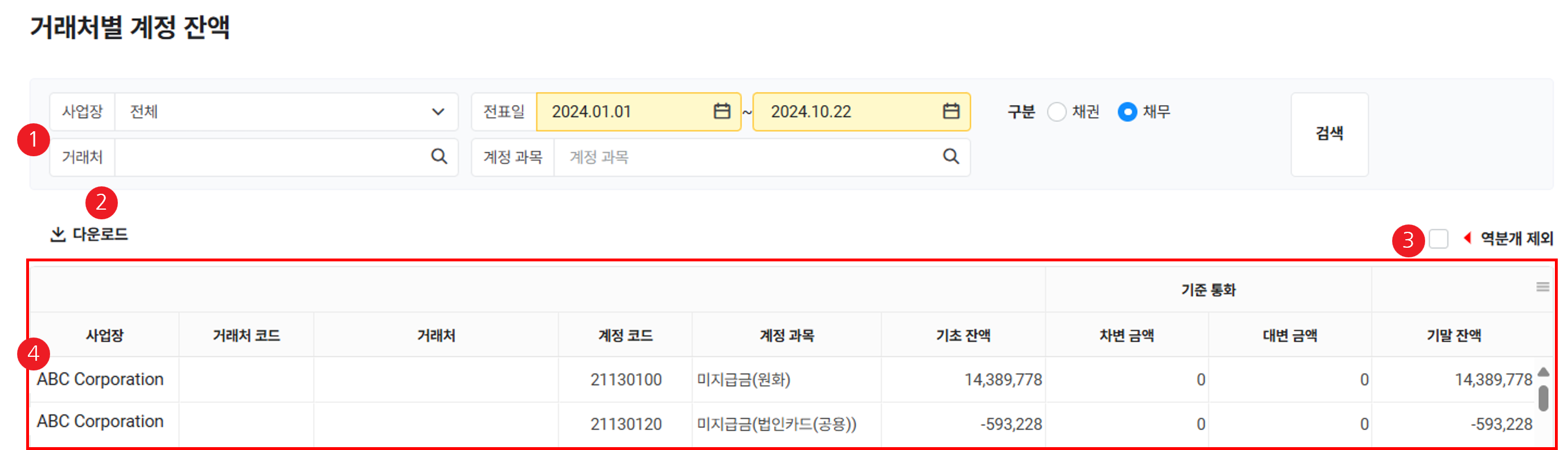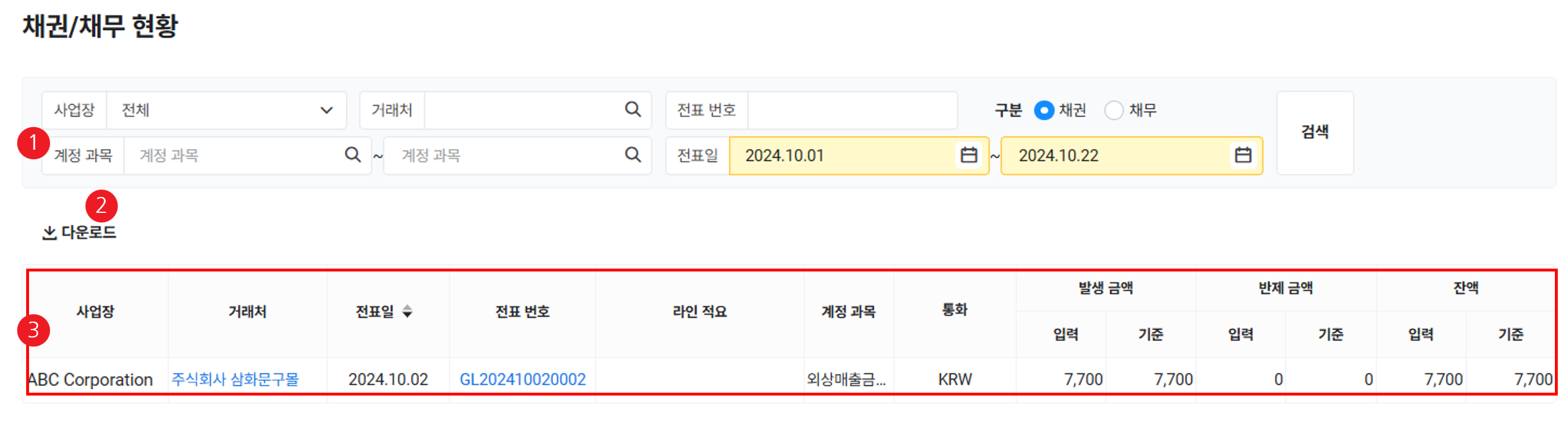 - 입력한 조건에 해당하는 채권/채무 내역 목록이 조회됩니다.