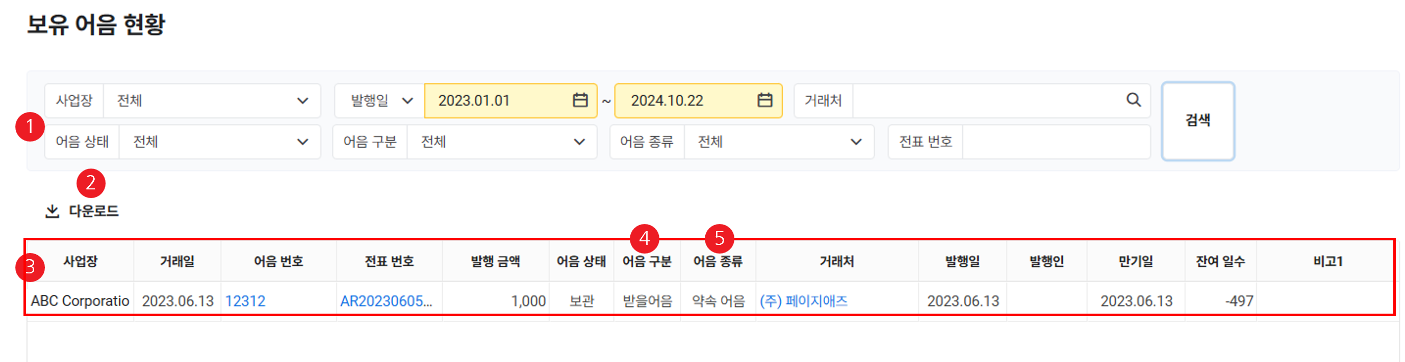 - 입력한 조건에 해당하는 보유 어음 목록이 조회됩니다.