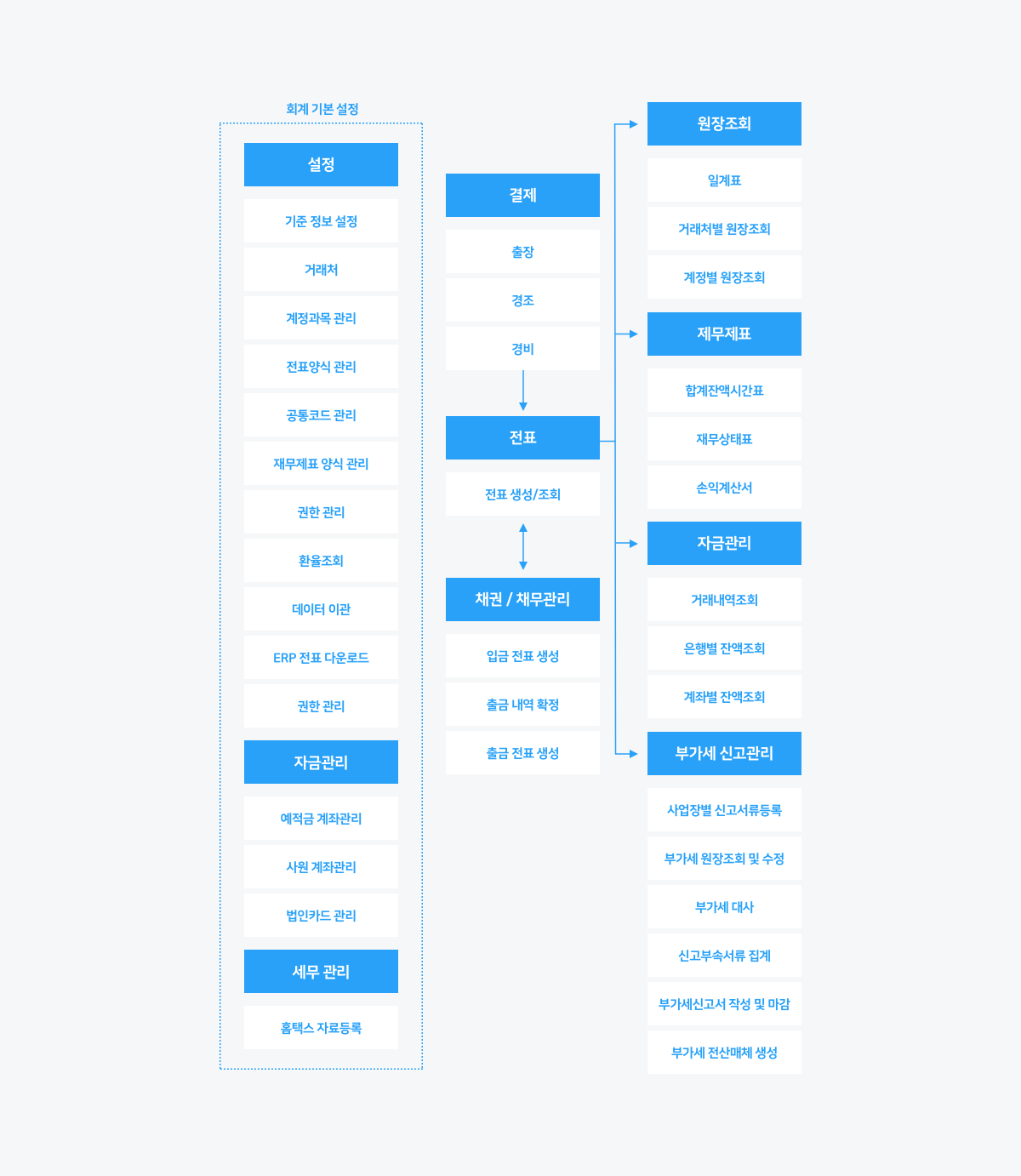회계 서비스에서는 회계 업무에 필요한 기본 설정과 환경을 구축하고, 전표, 채권/채무 관리, 고정자산 관리, 세무 및 기타 다양한 회계 업무 전반을 수행할 수 있습니다.