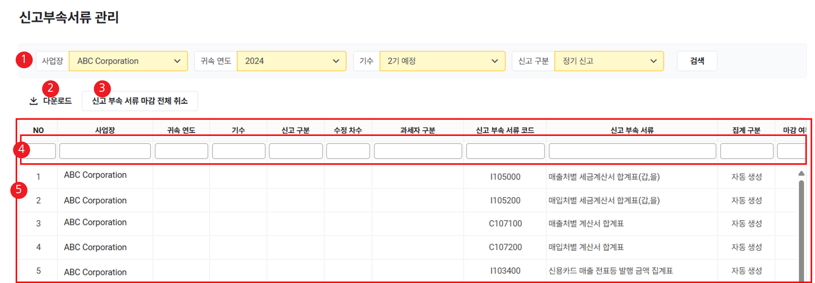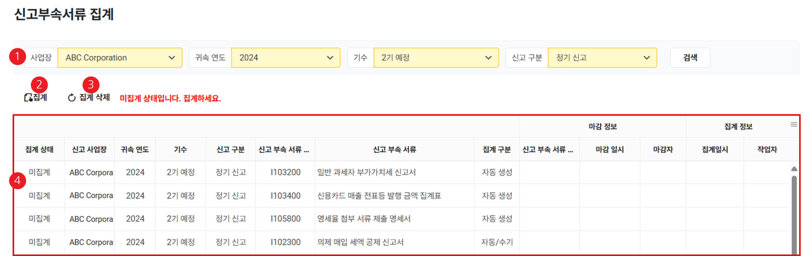 | ④ 신고 부속서류 집계 데이터 | 집계된 신고 부속서류 데이터 표시 |
